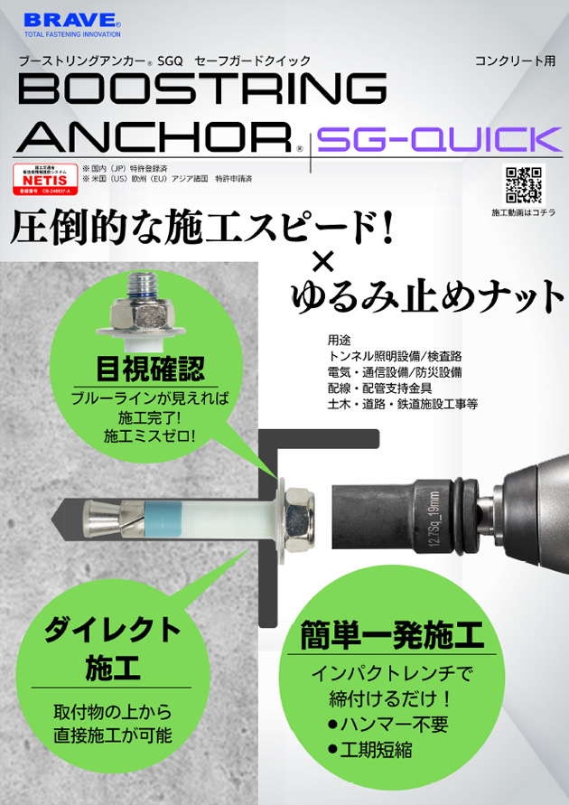 ゆるみ止めナット「フリクションリング付きナット」を組み合わせた、直接施工ができるブーストリングシリーズの一つ「SGQ タイプ」のサイズ表や施工