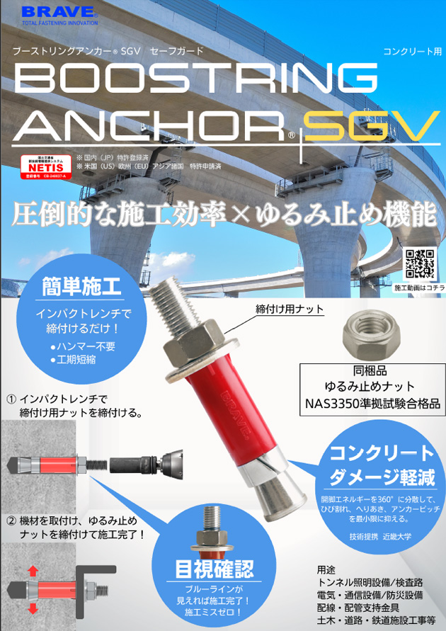 ゆるみ止めナット「フリクションリング付きナット」を組み合わせたブーストリングシリーズの一つ「SGV タイプ」のサイズ表や施工方法などをご覧いただけま
